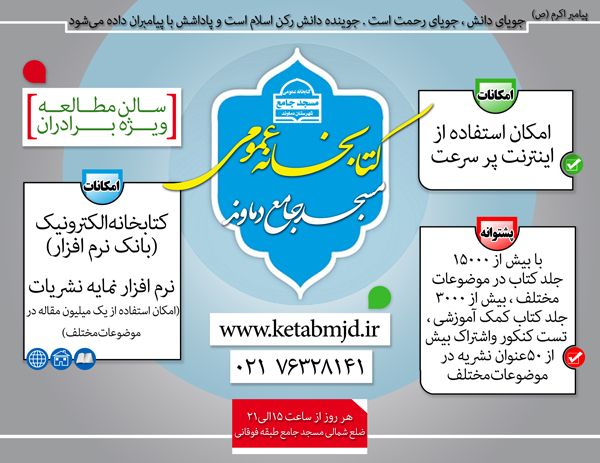 کتابخانه عمومی مسجد جامع دماوند مجهز به نرم افزار نمایه نشریات (تحت وب) می باشد .